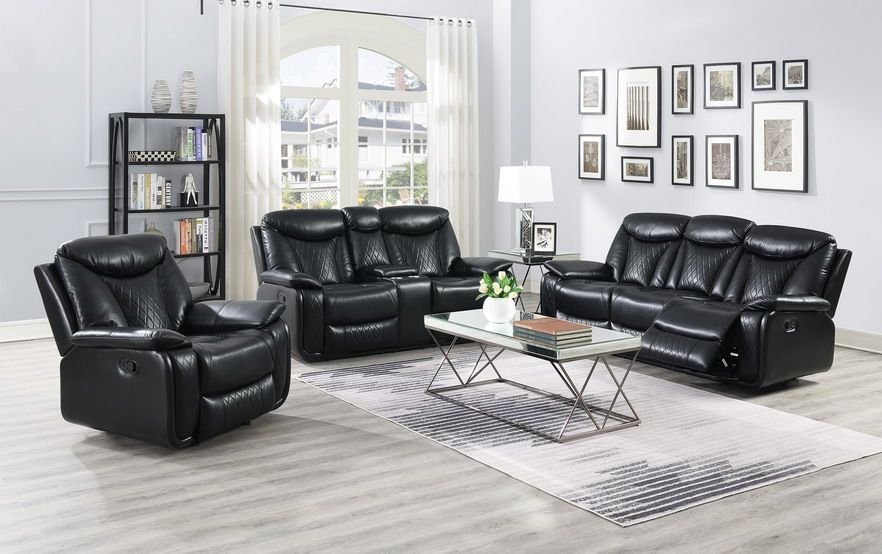 3 piece reclining set, leather reclining sofa set, black leather recliner set, reclining sofa loveseat chair, living room reclining set, luxury recliner furniture, home theater seating, leather recliner sofa, reclining loveseat with console, diamond stitched leather sofa, modern living room furniture, atlanta furniture store