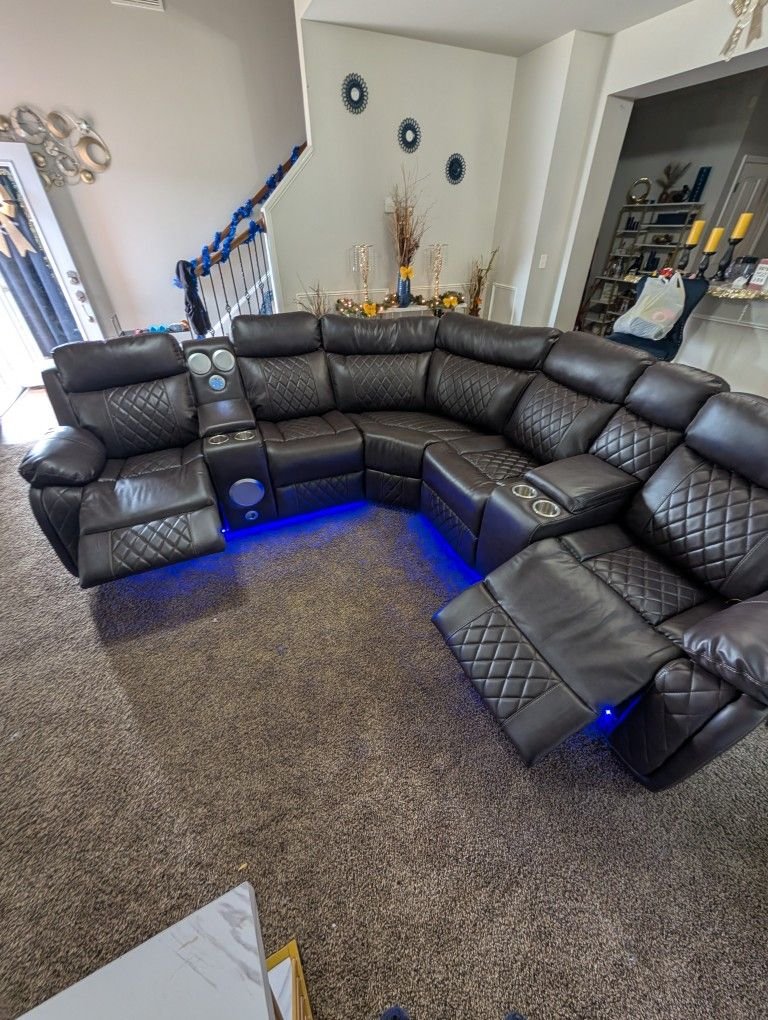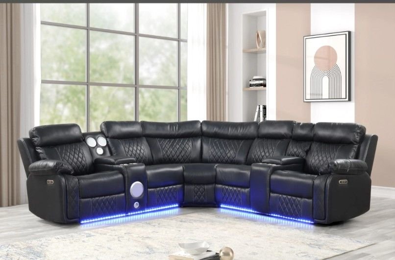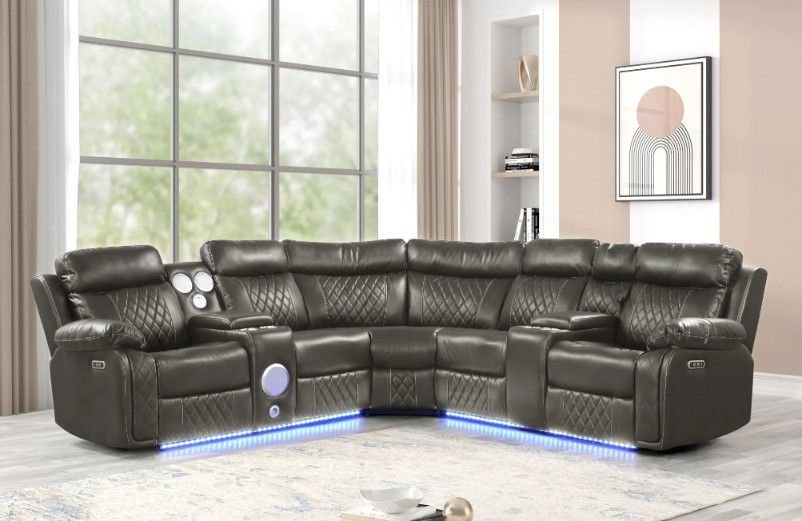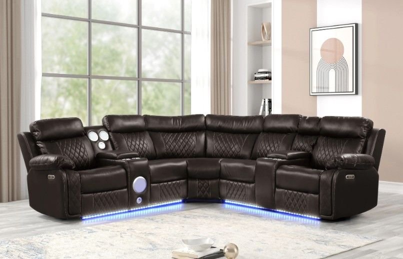 Upgrade your living room with this brand new luxury power reclining sectional, designed for comfort, technology, and modern style. This sectional comes factory sealed in original boxes and features LED base lighting, power recliners, and built-in speakers for the ultimate home experience.
